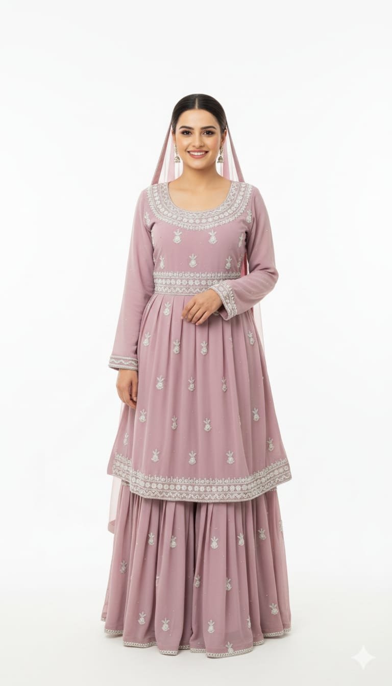 Add a touch of sophistication to your wardrobe with this light onion frock sharara suit. Designed with fine hand work, its intricate details ensure you stand out at every event.