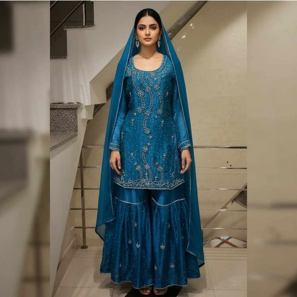 Elegant royal blue straight sharara suit with fine handwork, perfect for party wear, festive occasions, and special celebrations. Stylish, comfortable, and designed to make you stand out.